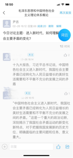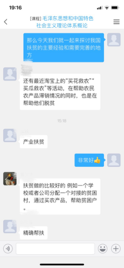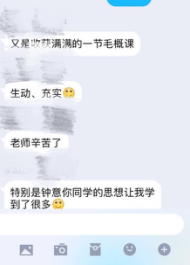 同时,借助于丰富的网络教学资源,课程组教师精湛的组织能力以及人性化的网络教学平台,同学们体验了另一种方式的思政课。没有了面对面交流的压力,更多是畅所欲言的自在与思想火花的碰撞。借助于网络教学,在更为热烈的交流中去推动习近平新时代中国特色社会主义思想学深悟透、入脑入心、落地生根。